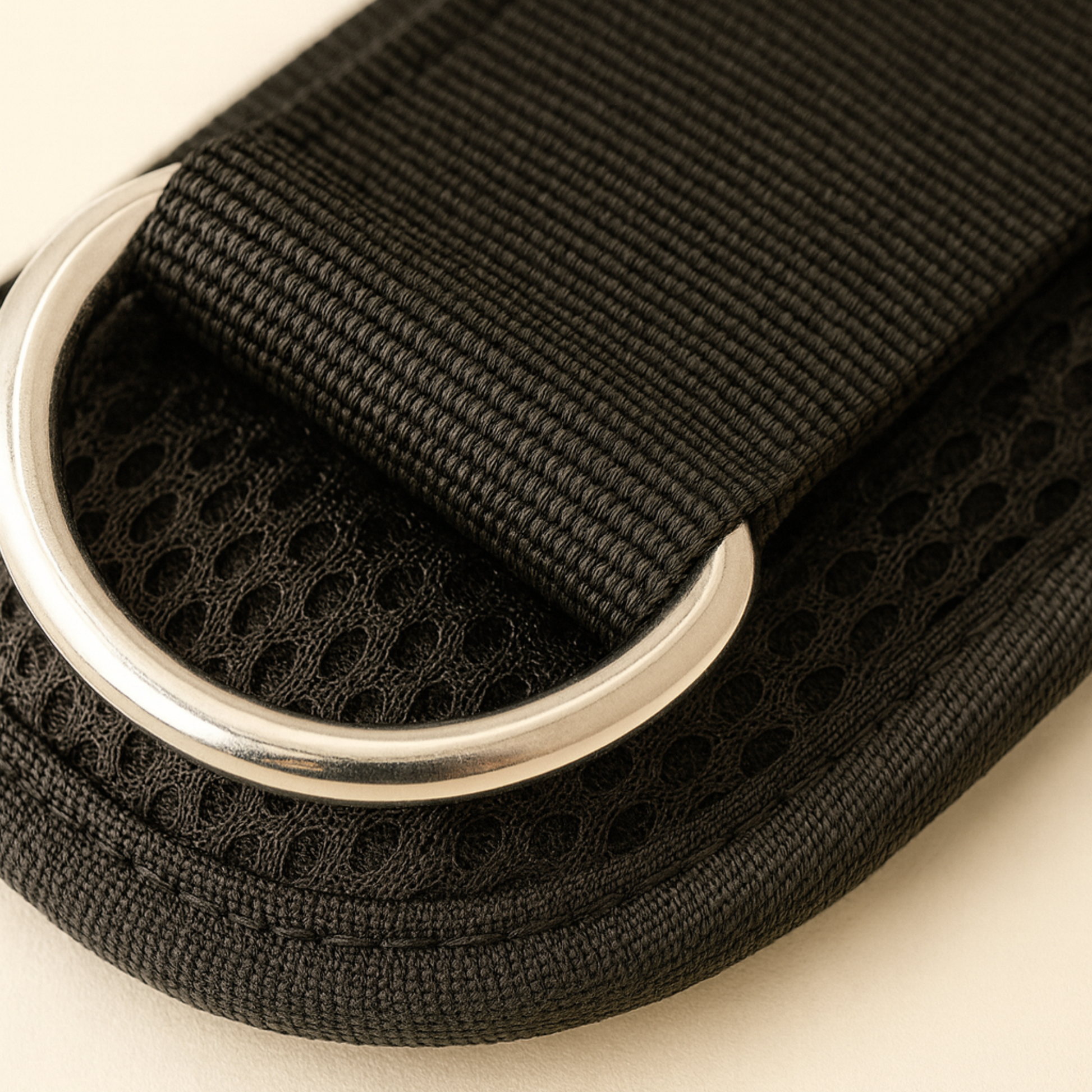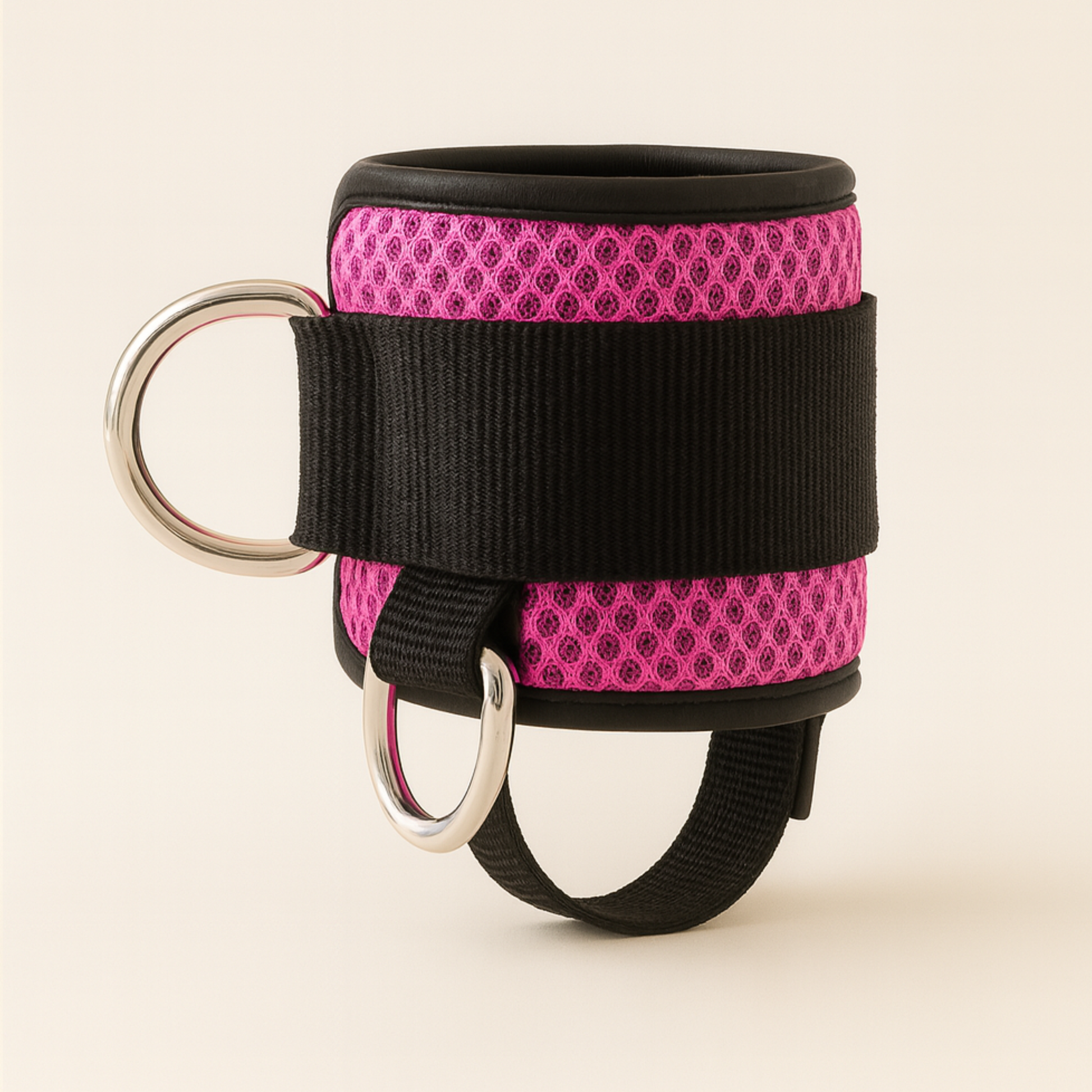 This ankle strap provides a stable, padded connection for cable machines and functional trainers. The SBR build, reinforced metal D-rings, and secure hook-and-loop closure keep it steady through repeated sets, while the mesh-backed padding maintains comfort. The adjustable strap accommodates a wide range of ankle sizes and clips smoothly into standard gym equipment.